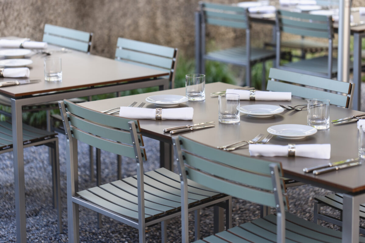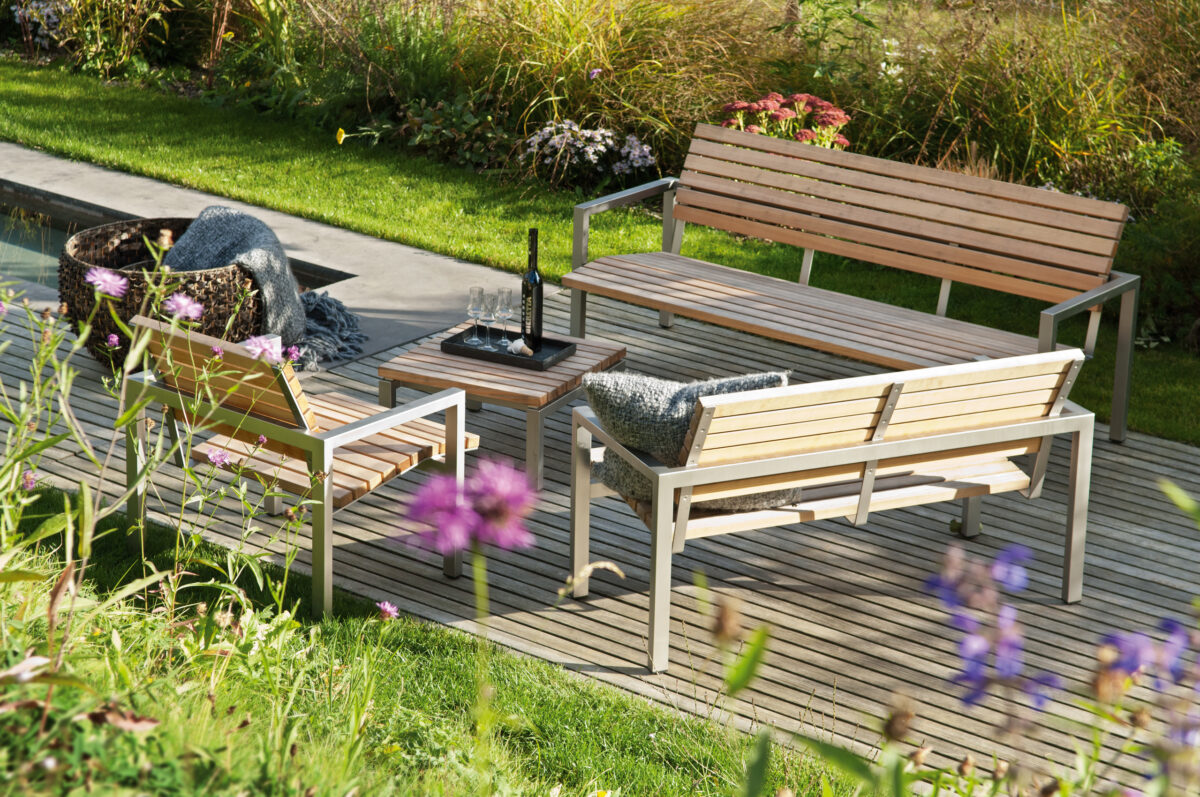 Für unsere Outdoormöbel verwenden wir Schweizer Lärche und Schweizer Eiche, Naturstein, Vollkernmaterial (Inex), satiniertes Plexiglas sowie Gestelle aus Chromstahl.